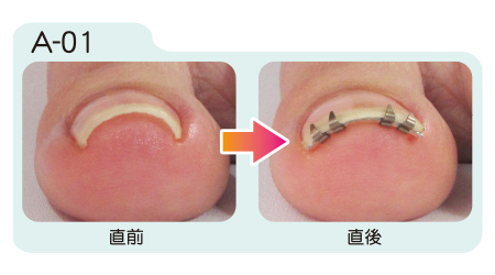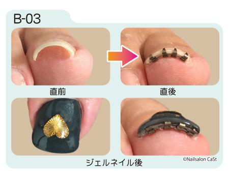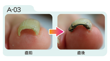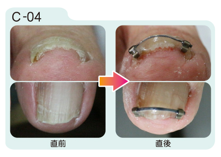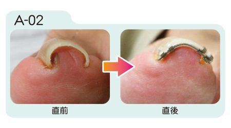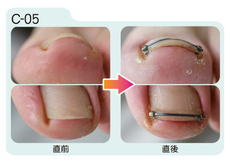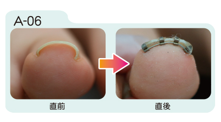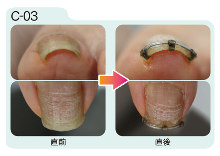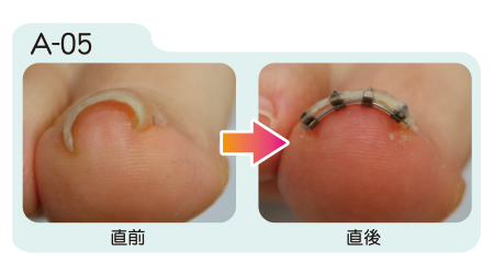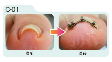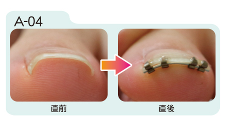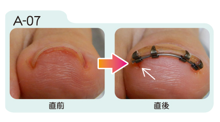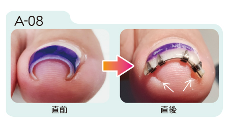 まきづめリフトは装着直後から矯正効果が現れます。装着から約1週間の間に更に矯正が進み、その後は器具を取り外すまで矯正状態が保たれます。取り外しの目安は約1ヶ月から2ヶ月。爪が伸び、日常生活に支障をきたすようになったら取り外します。