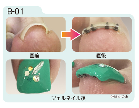 片側の爪が薄く、割れてしまう恐れがあったため、クリップ二つを寄せて装着後、爪とクリップ周辺にグルー(瞬間接着剤)を塗布し補強しました。