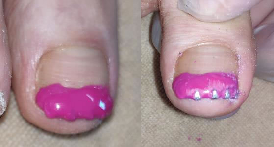 右の装着直後の写真は透明のジェルネイルで固めてあります。ジェルネイルは固まっても弾力性がありますから矯正力がなくなることはありません。