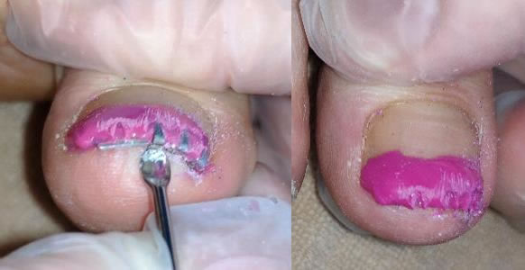 厚い爪を削ってまきづめリフトを装着しました。装着前と装着直後の写真です。