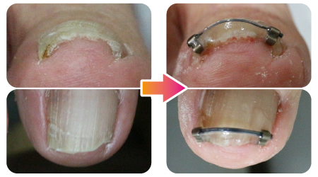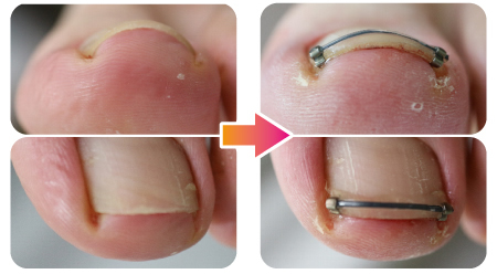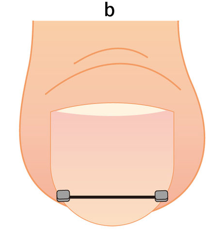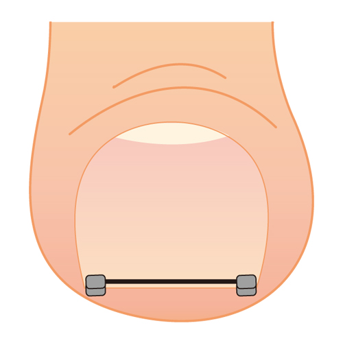 爪先のゆびから浮いている白い部分が短すぎると製品が当たって痛みます。その場合、爪の両端に1mm程度の長さがあれば、まきづめリフトを逆さま(ワイヤーが爪の上に来る)にし両端に掛けます。